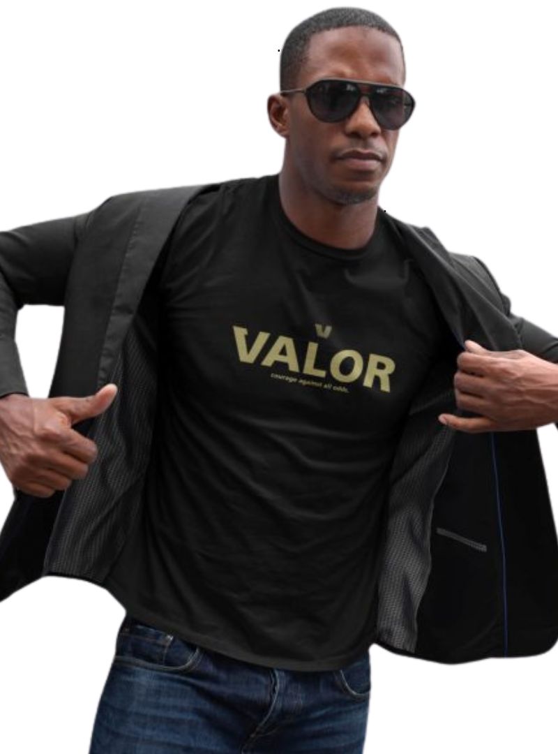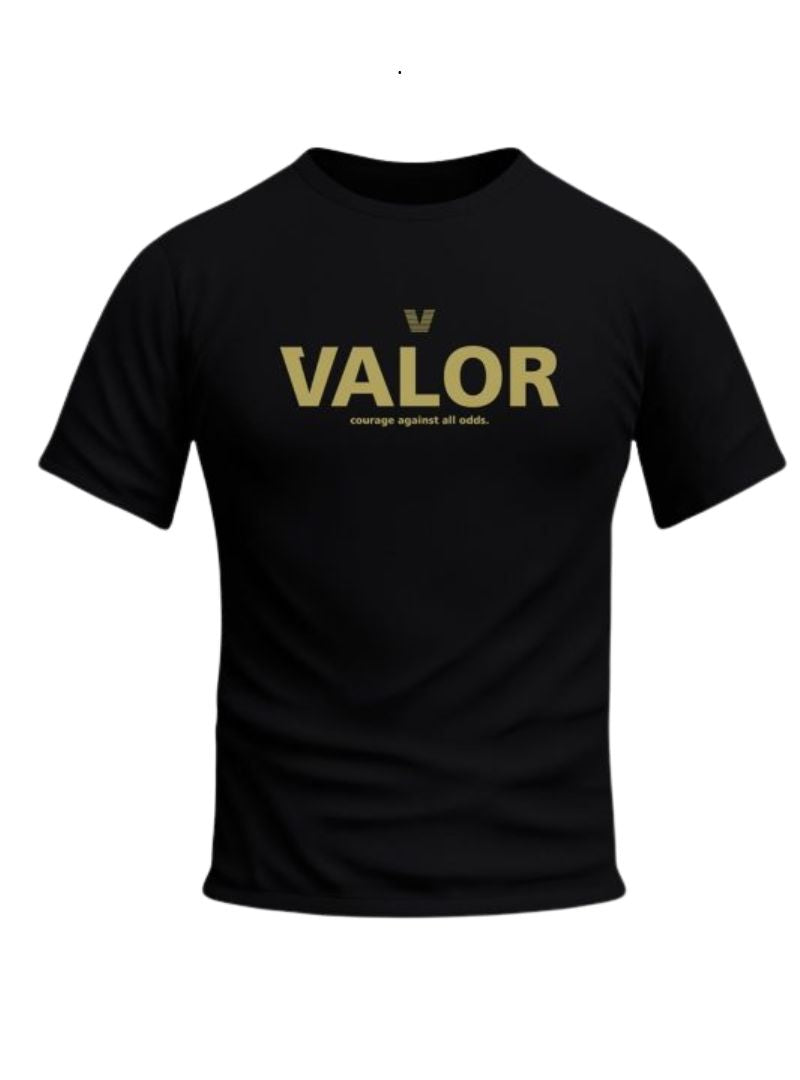 # Valor Mens Printed Tee - Black/Gold Bold meets timeless with this striking printed tee that commands attention. The classic black base pairs perfectly with gold accents, creating a look that works whether you're heading out for the day or keeping it casual at home. Premium comfort meets eye-catching style—because looking good shouldn't feel like a compromise. Perfect for guys who want their wardrobe to have personality without trying too hard.