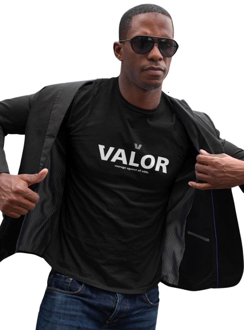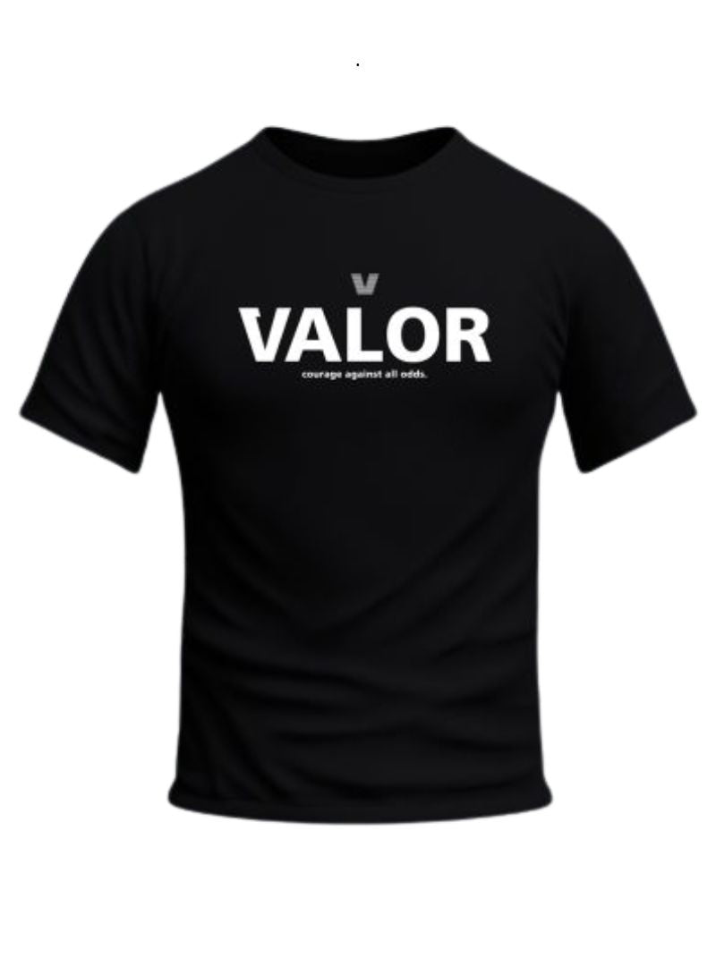 # Valor Mens Printed Tee - Black Bold graphics meet everyday comfort in this classic men's printed tee. Crafted for those who wear their attitude on their sleeve—literally. The crisp black base keeps things versatile, while the eye-catching print adds personality to your casual rotation. Whether you're heading out for coffee or catching up with mates, this tee delivers style without the fuss. Soft, durable, and ready for whatever the day throws at you.