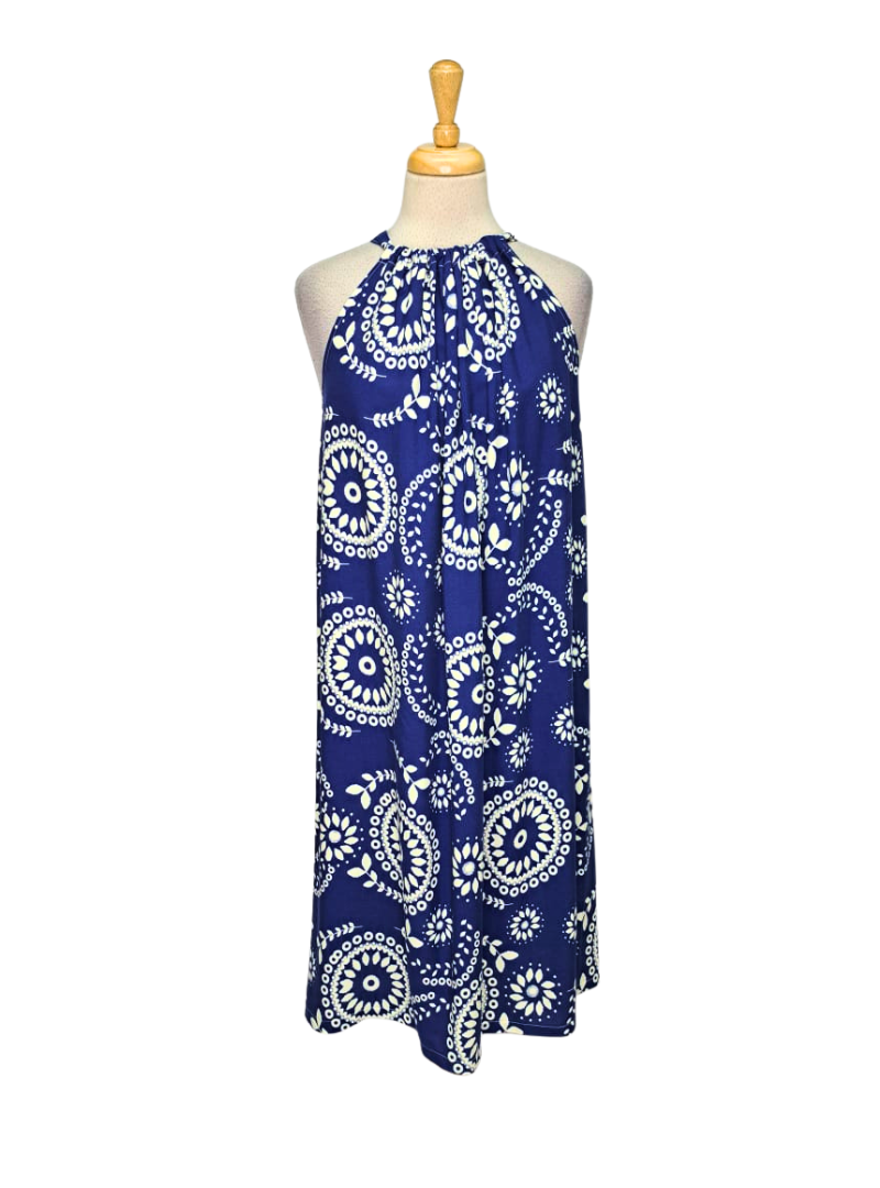 This adjustable halter midi knee length dress is your summer essential. Pull the neckline to customize the fit and length—tighter pulls mean higher hemlines, so you control the look. Lightweight and breathable, it's perfect for warm days and effortless style. The clever design adapts to your body, fitting most sizes from Small to Large. Dress it up for evening or down for casual outings. One versatile piece, endless possibilities.