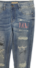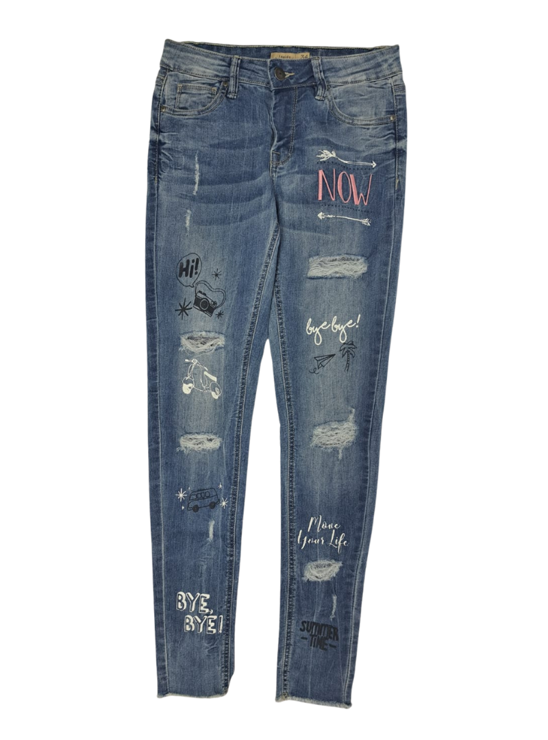 These blue printed ladies’ jeans feature stylish ripped details and a unique pattern of printed cars and buses, adding a playful, urban touch to your wardrobe. Designed for comfort and style, they are perfect for casual outings where you want to stand out effortlessly. Embrace a blend of trendy fashion and distinctive design with these eye-catching jeans.